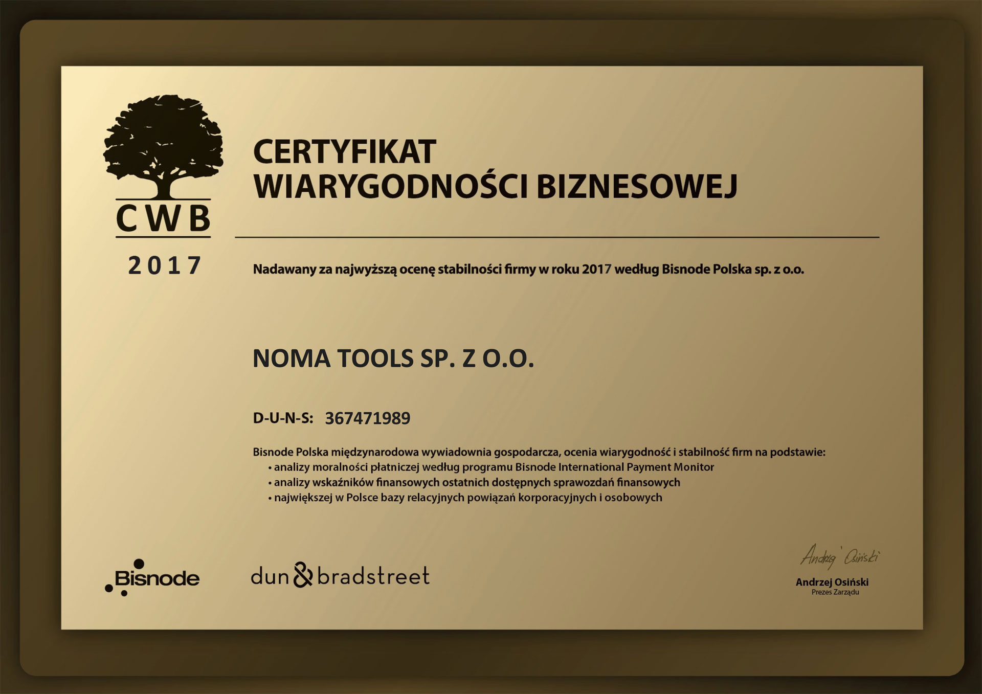 Certyfikat Wiarygodności Biznesowej dla Noma Tools 2017