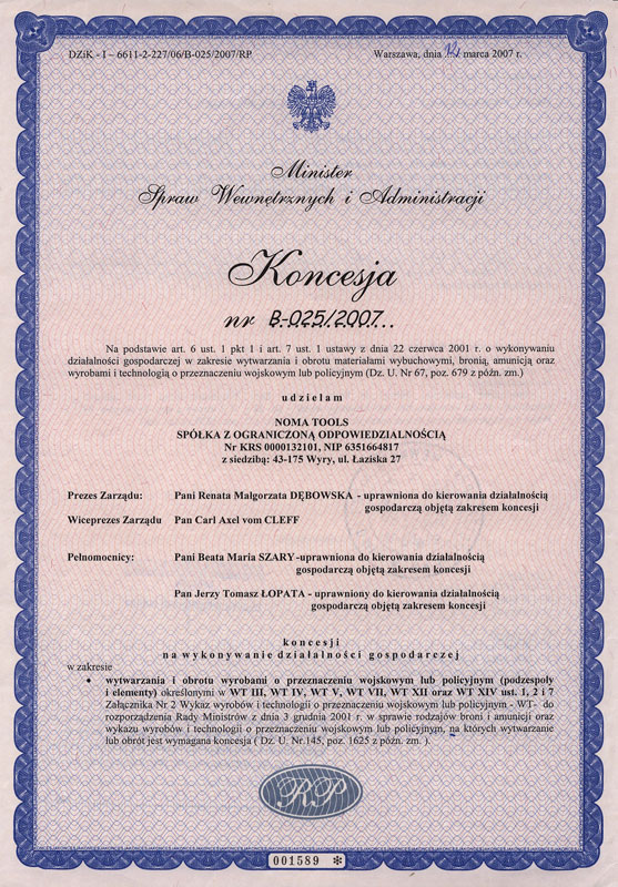 Spółka NOMA Tools otrzymała koncesję na wykonywanie działalności gospodarczej w zakresie wytwarzania i obrotu wyrobami o przeznaczeniu wojskowym lub policyjnym, czas ważności koncesji - 50 lat.