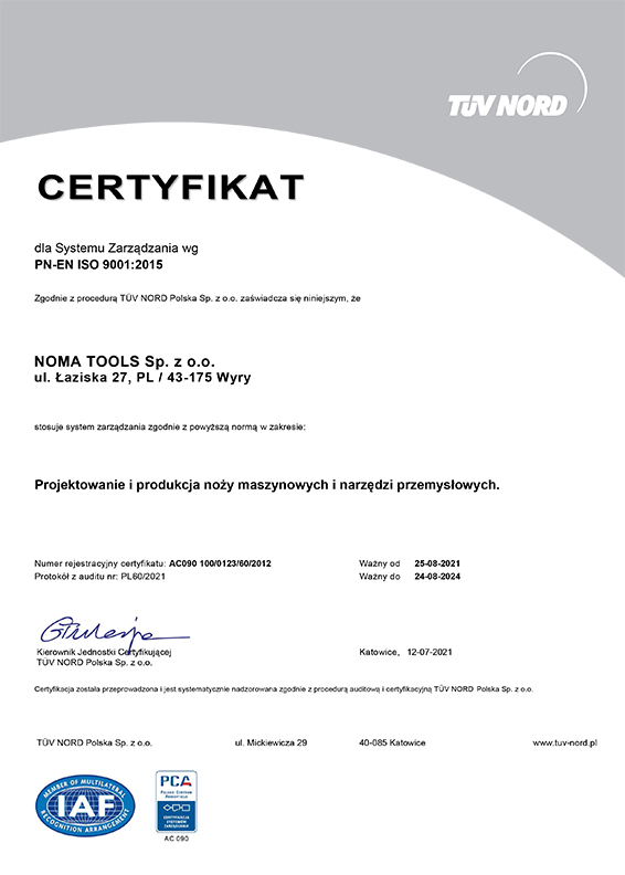 NOMA Tools, to jeden z nowocześniejszych i uznanych na rynku światowym producentów wysokiej jakości noży przemysłowych i narzędzi zużywających się w procesach cięcia, skrawania, kruszenia, mielenia. Wysoka jakość nie jest dziełem przypadku, lecz wynikiem ściśle przestrzeganego reżimu technologicznego, wieloletniego doświadczenia i wysokich umiejętności naszych specjalistów.
