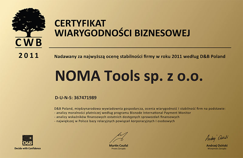 Certyfikat Wiarygodności Biznesowej dla Noma Tools 2011