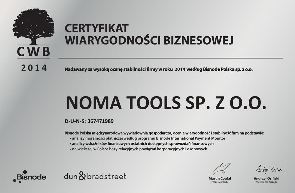 Certyfikat Wiarygodności Biznesowej dla Noma Tools 2014