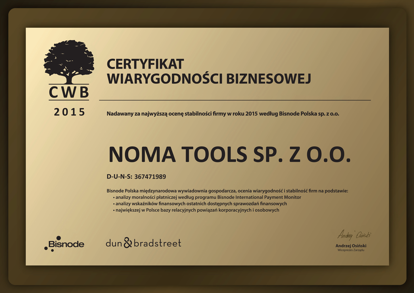 Certyfikat Wiarygodności Biznesowej dla Noma Tools 2015