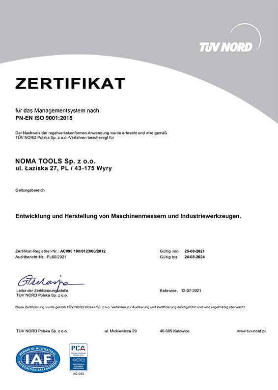 Мы производим режущий инструмент и запчасти для машин и технологических линий всех ведущих компаний. Мы снабжаем как рынок производителей оборудования, так и его пользователей. Мы работаем только с известными поставщиками инструментальных сталей. Особое значение мы придаем процессу термообработки и многоступенчатому контролю качества. Контролируемый на каждом этапе производственный процесс отвечает требованиям стандарта PN - EN ISO 9001. Высокое качество нашей продукции – это совместная работа всей нашей команды, которая единодушно и сознательно реализует принятую политику качества.